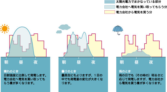 太陽が出ていれば発電しますが、曇るとあまり発電できなくなります。そういった時は、不足分の電気を電力会社から買って使います。ですから、曇っていても雨が降っていても、電気が使えなくなることはありません。