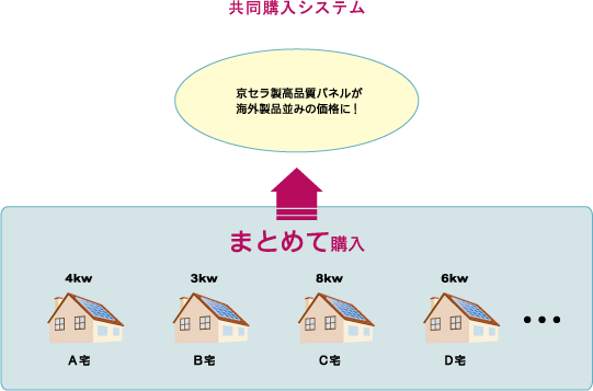 (合)さつま自然エネルギーの産業用メガソーラー事業では、15の施設等をまとめてメーカー等と交渉して設置することによって、設置コストを飛躍的に抑えることができました。この共同購入のメリットはそのまま住宅用ソーラーサポートシステムにも生かされています。つまり、共同購入は1軒当たりの設置コストを抑えることで設置者をサポートし、エネルギーの地産地消に役立つシステムです。